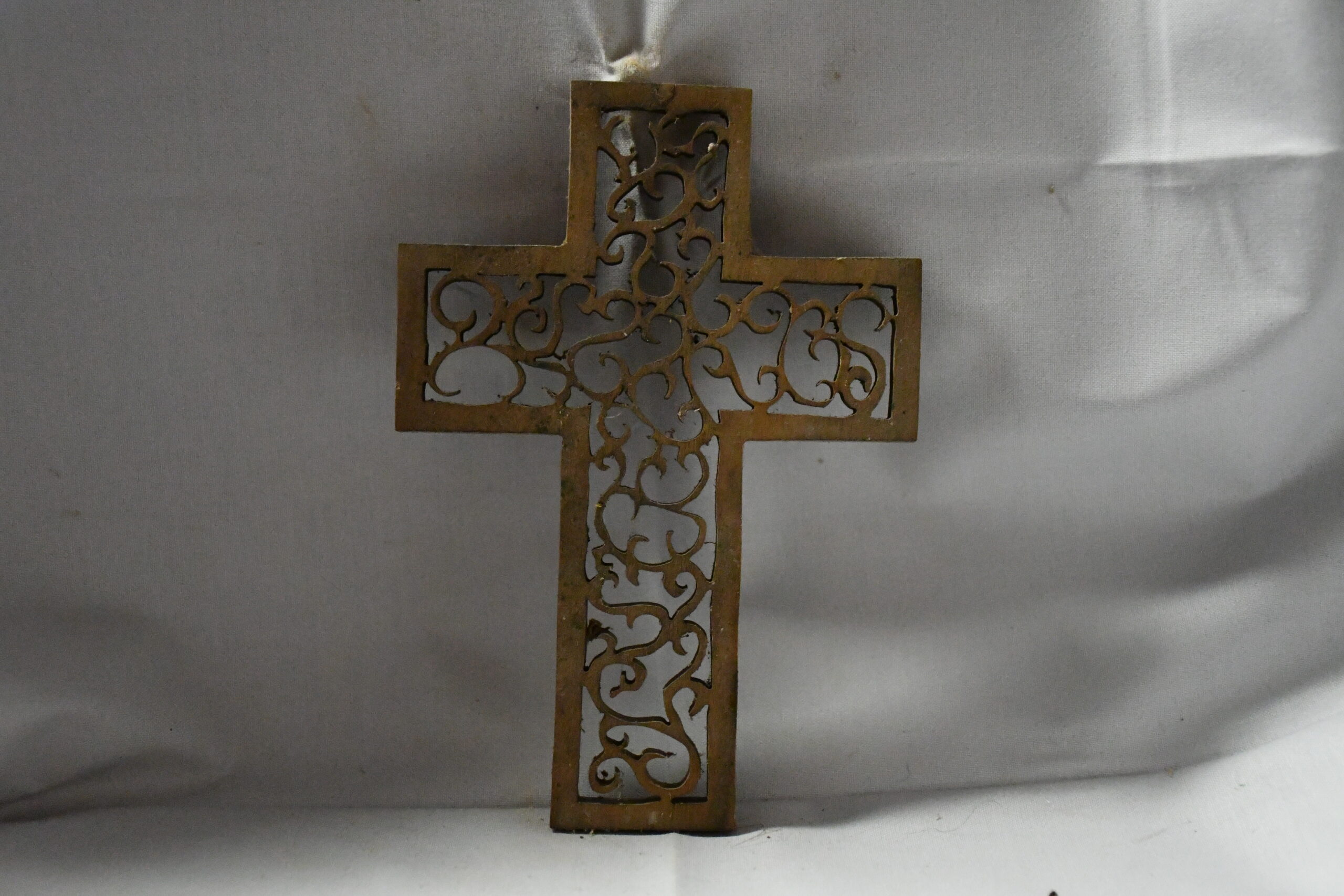 Wooden cross with vine motif and elegant border detailing.