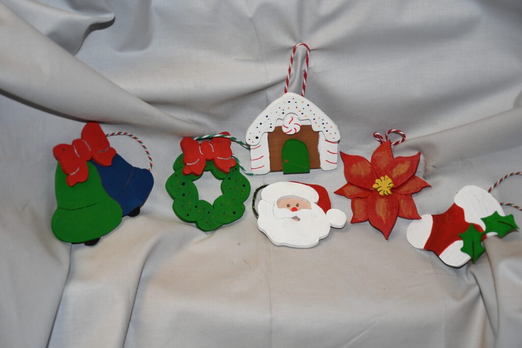 Ornaments set of 6 (Wreath w/bow, Bells w/bow, Santa face, Candy House, Poinsettia, Stocking).