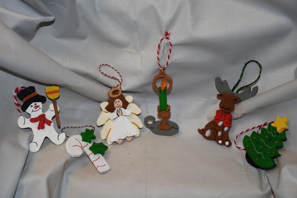 Ornaments set of 6 (Candle, Christmas Tree, Reindeer, Angel, Snowman, Candy Cane).